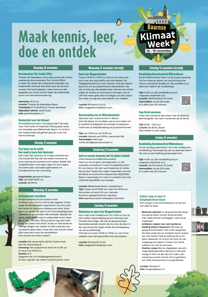 De Groene Inval organiseert op woensdagmiddag 12 november een duurzame knutselmiddag voor kinderen. Op donderdagavond 13 november is er in de bibliotheek een informatieve avond over “Geld en energie besparen met de juiste techniek”, georganiseerd door BaarnDuurzaam. Op zaterdag 15 november is het mogelijk om aan te sluiten bij het team van de Baarnse Bermbrigade om zwerfafval op te ruimen.